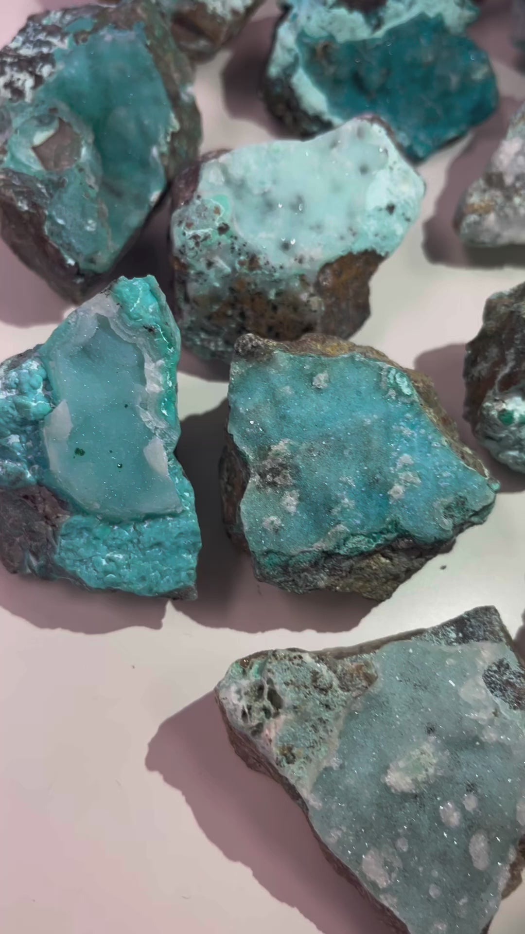 Druzy chrysocolla, a form of chrysocolla with tiny quartz crystals, is believed to promote love, healing, and calm, while also aiding in communication and emotional balance.