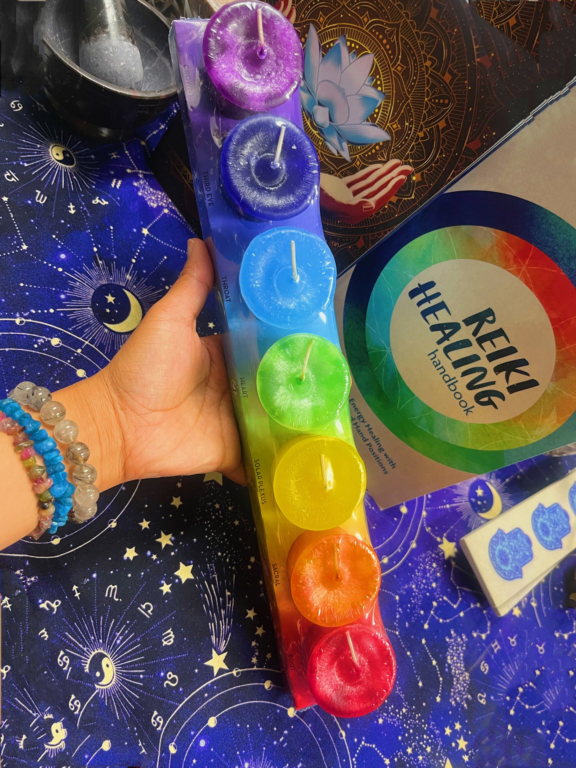 Intention setting:While lighting the candles, you can set intentions related to the chakra you are focusing on, such as grounding, creativity, self-love, or spiritual connection.
